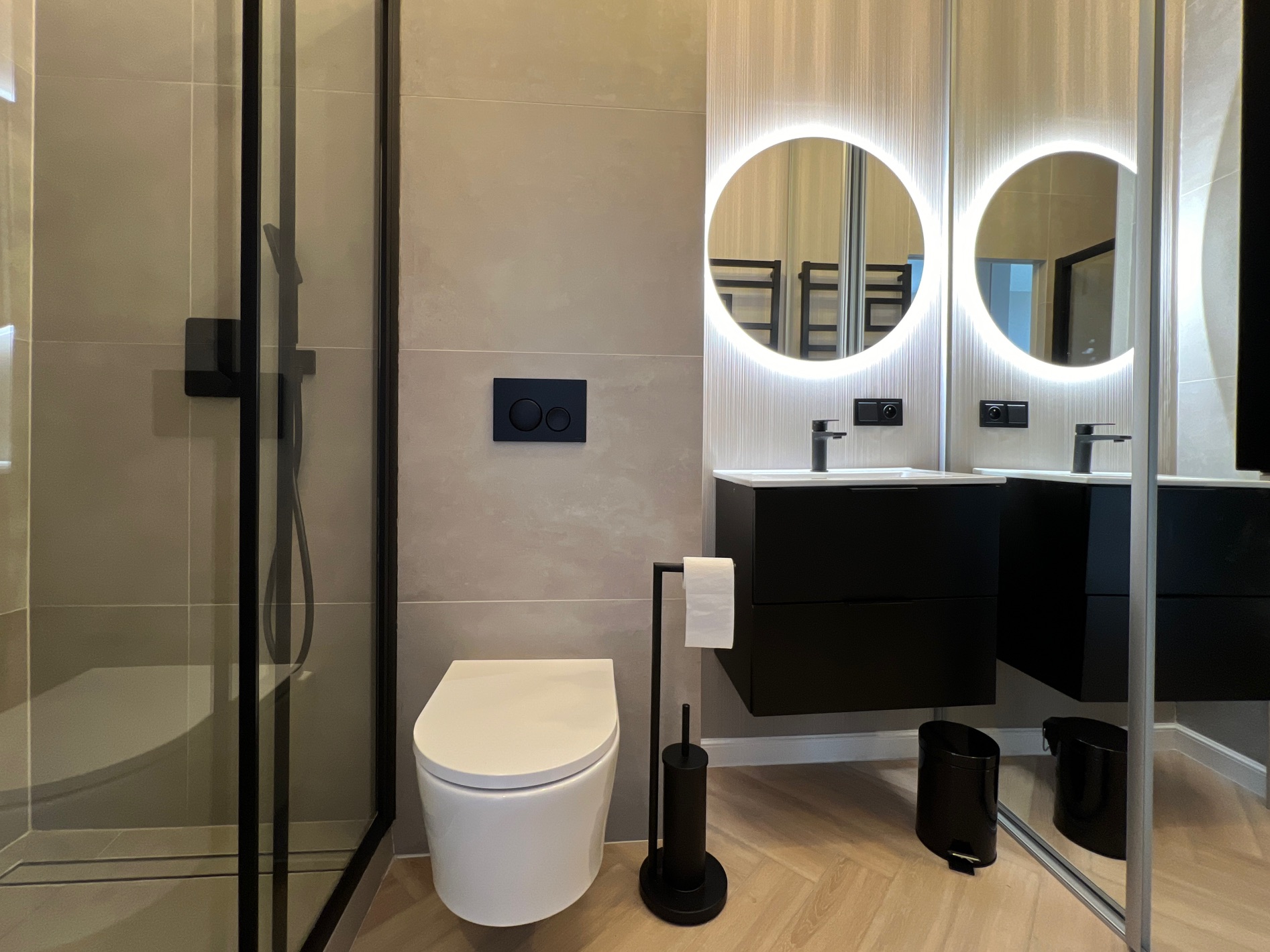 - łazienka (gres wielkoformatowy, kabina prysznicowa, wc, umywalka, armatura)